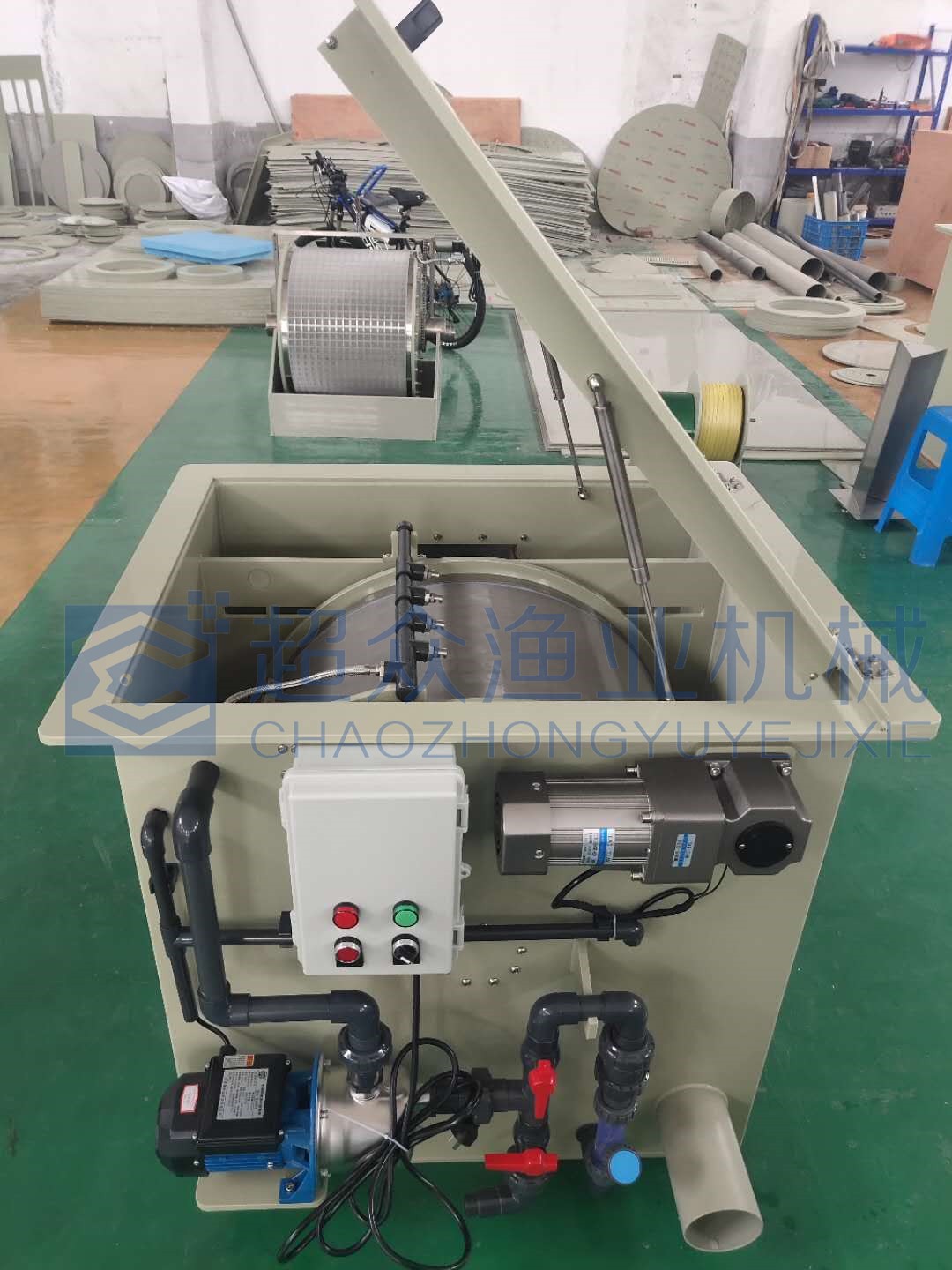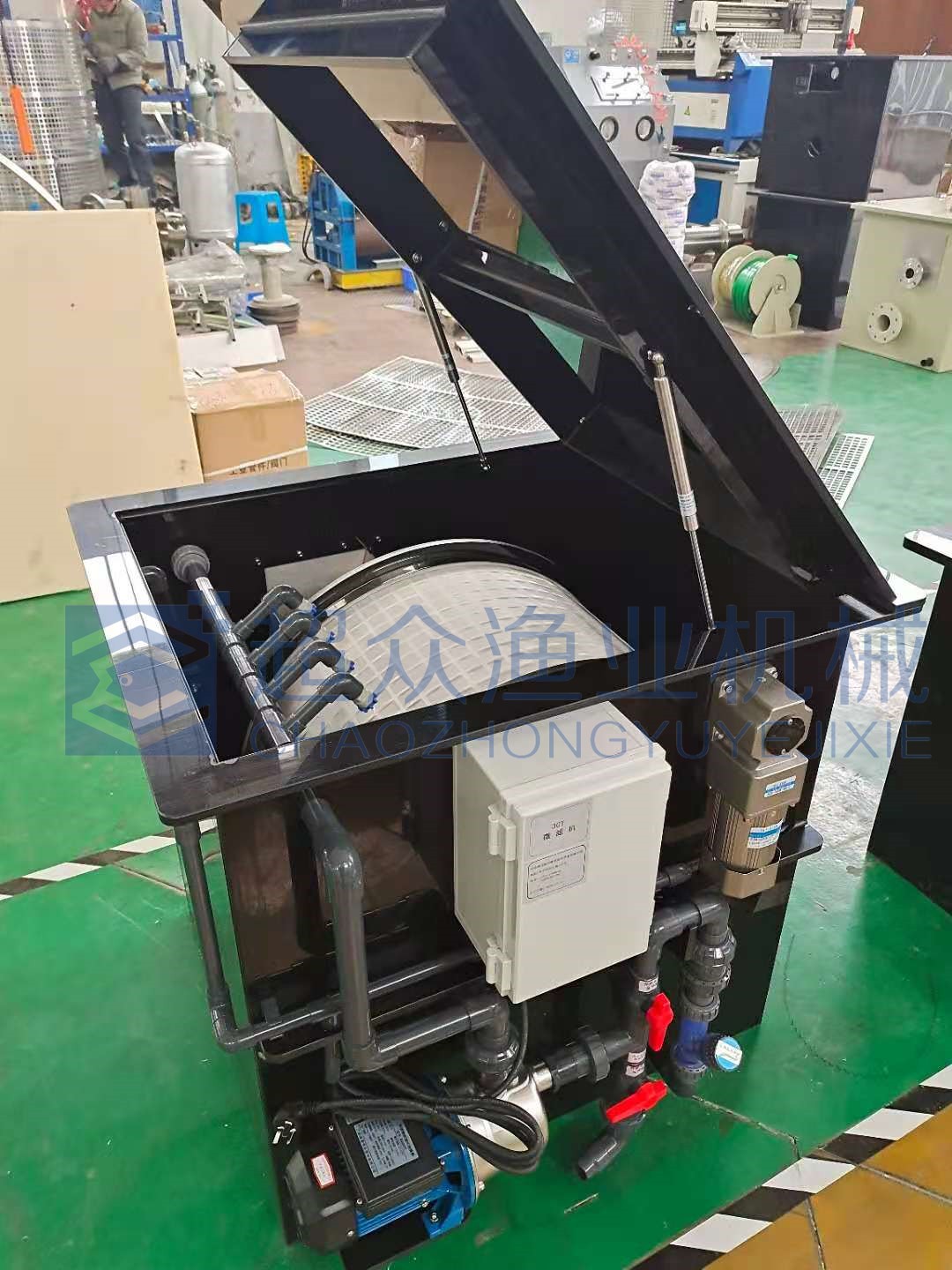 采用先进技术制造的全自动转鼓过滤器,是一款低能耗机械式物理过滤设备,经由微 滤器的滤网可快速、高效的将水中的悬浮颗粒物、残留饵料、粪便过滤并除去,经排 污管道排除。配合循环水养殖系统的其他设备完成一系列的水处理流程。